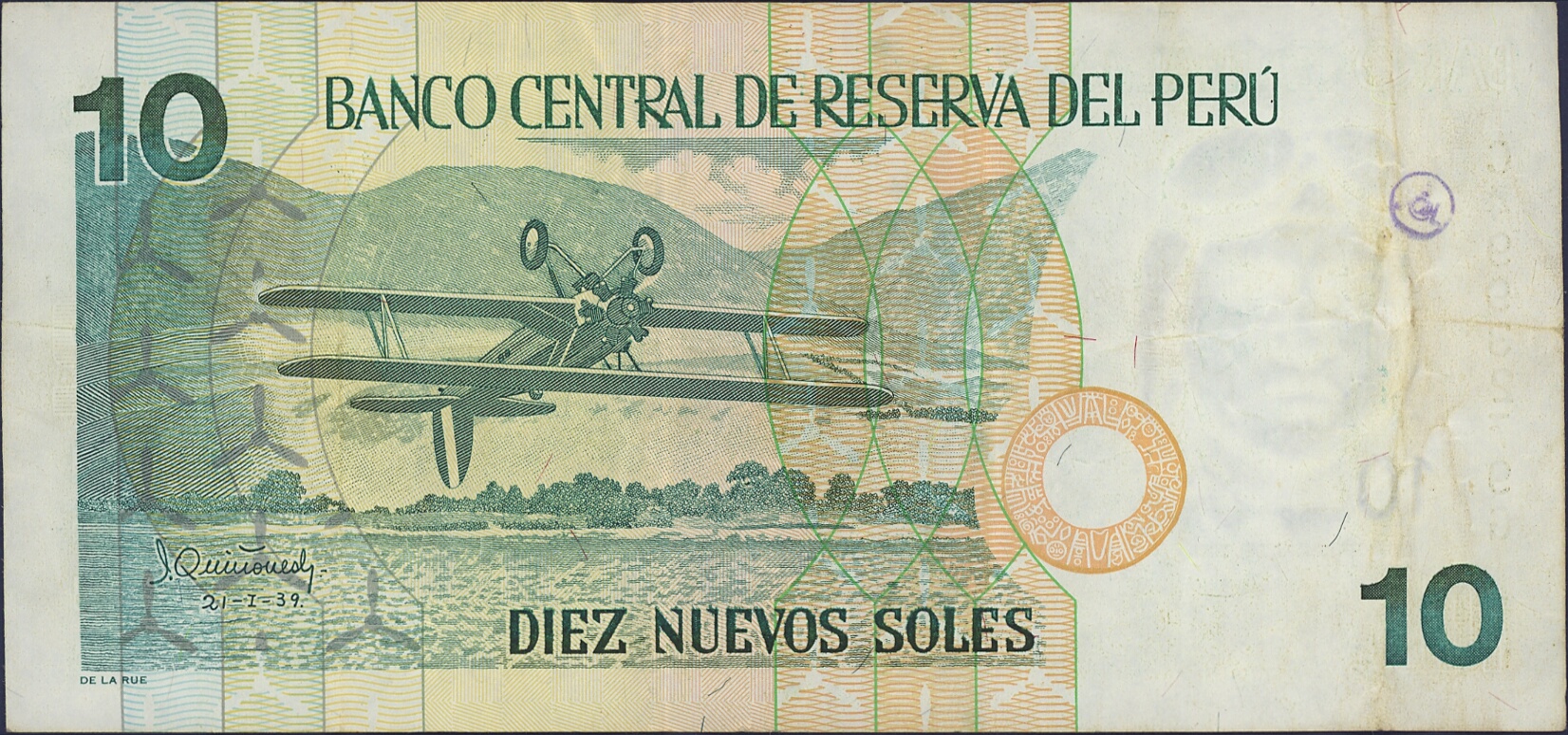 | Descrizione | Aereo combattente dell'epoca della WW II come monumento in alto al centro. José Abelardo Quiñones a destra, stemma in alto a destra. |