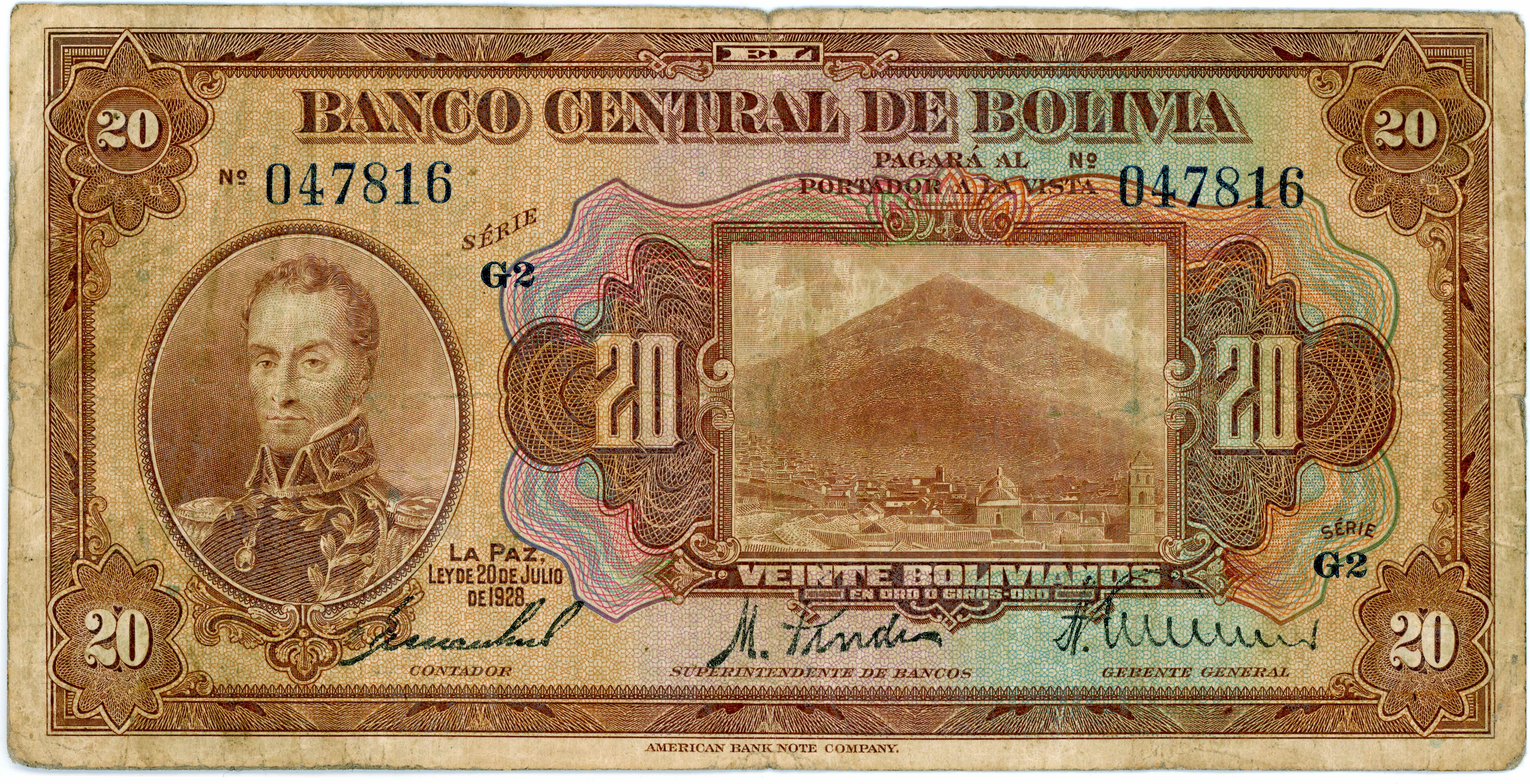 Ritratto di S. Bolivar a sinistra, Veduta di Potosi e montagne a sinistra. |