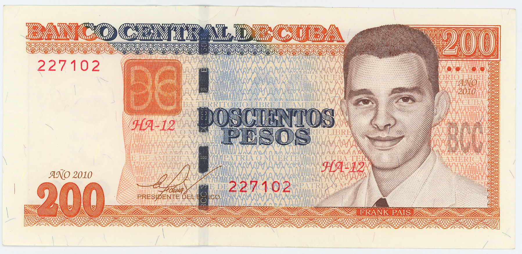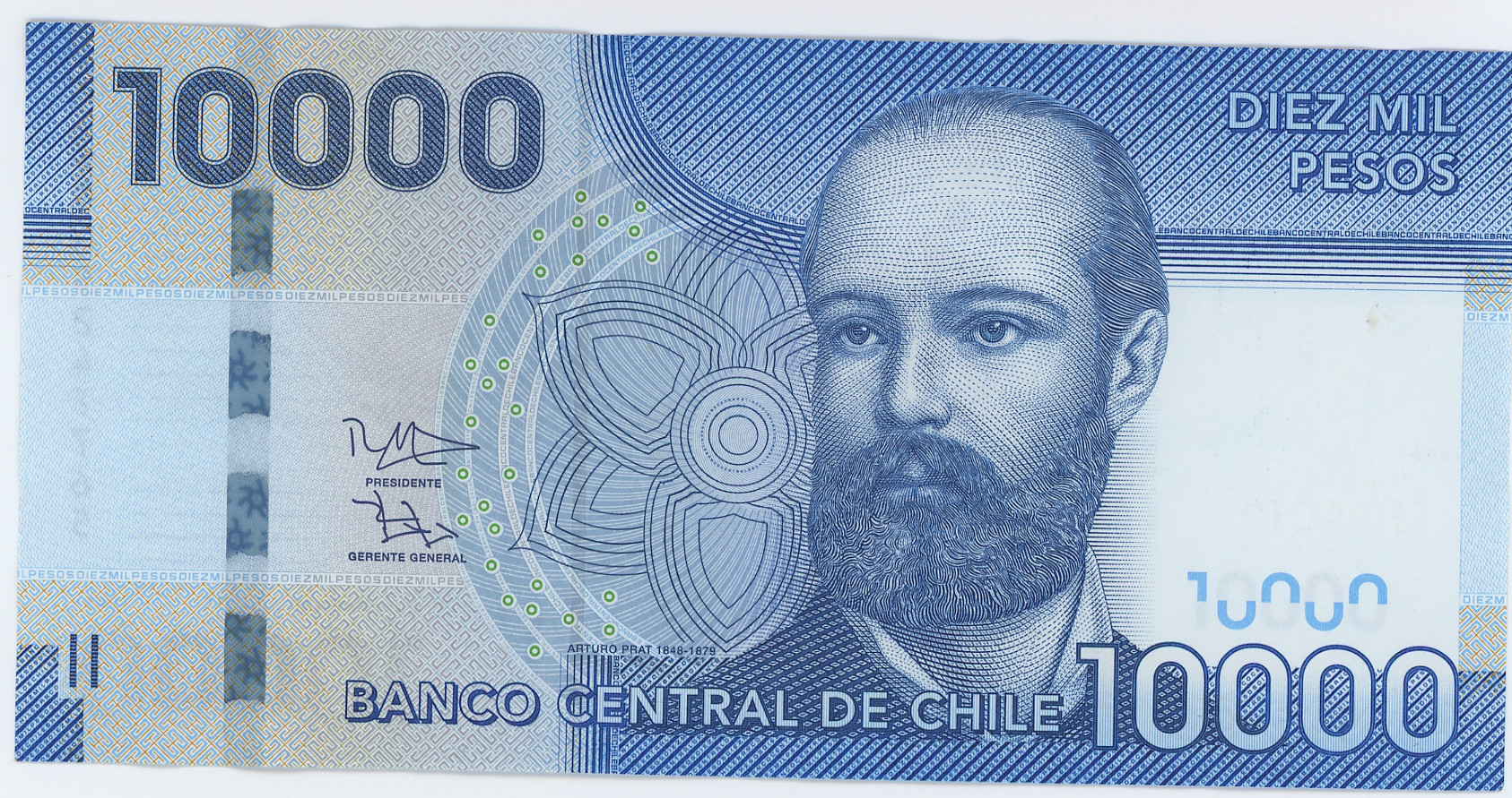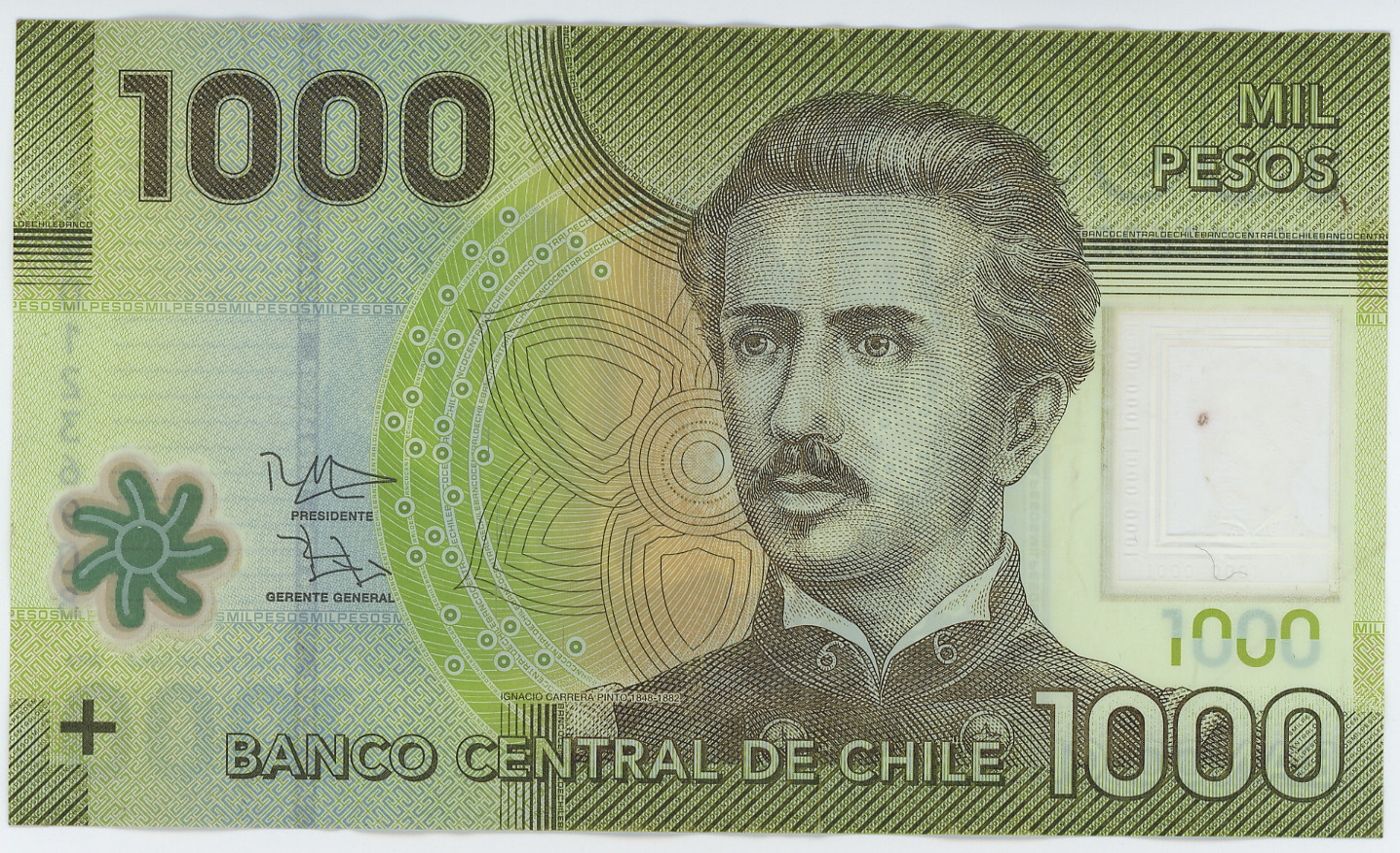 Davanti: Il sole stilizzato con inchiosto O.V.I. (Optical Variable Ink) rosso-oro, rappresentazione stilizzata del "corazón del copihue" (cuore del campanello cileno) e Ignacio Carrera Pinto. |