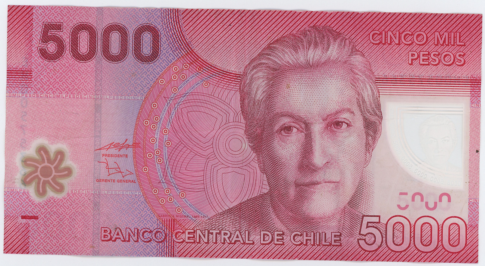 La parte anteriore di questa banconota presenta un ritratto di Gabriela Mistral, immagini del cuore di Copihue, Antu e il fiore nazionale, il simbolo di mapuche che rappresenta il sole e la fertilità. |