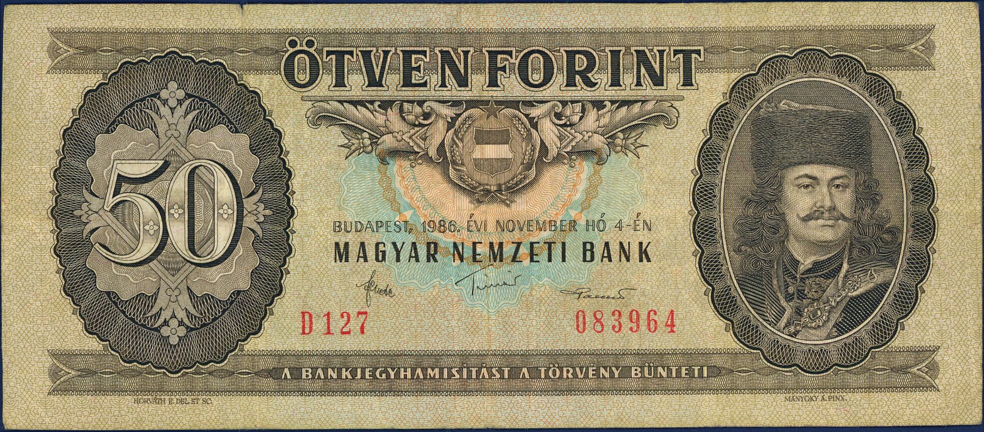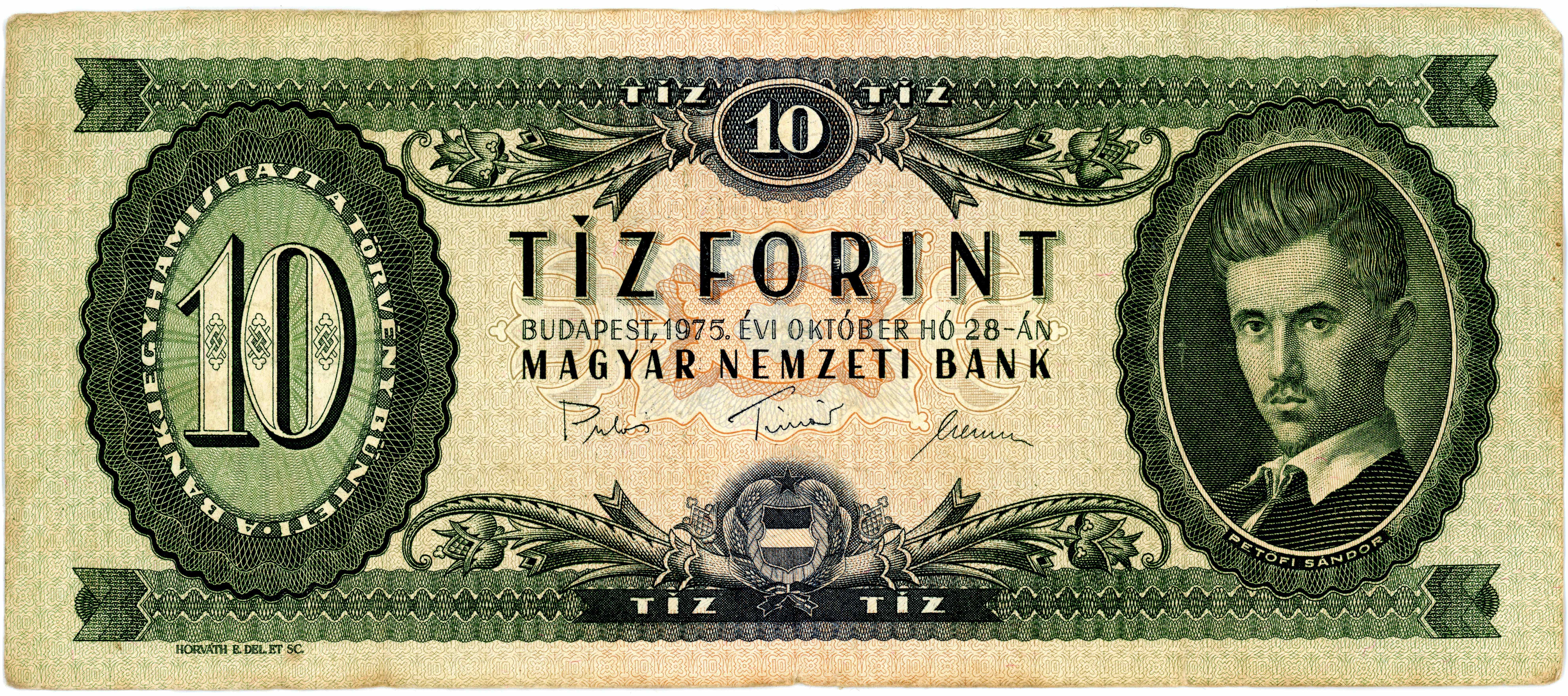 Ritratto di Sandor Petrofi a destra. Valore a sinistra, stemma con bandiera a tre fasce al centro in basso. |