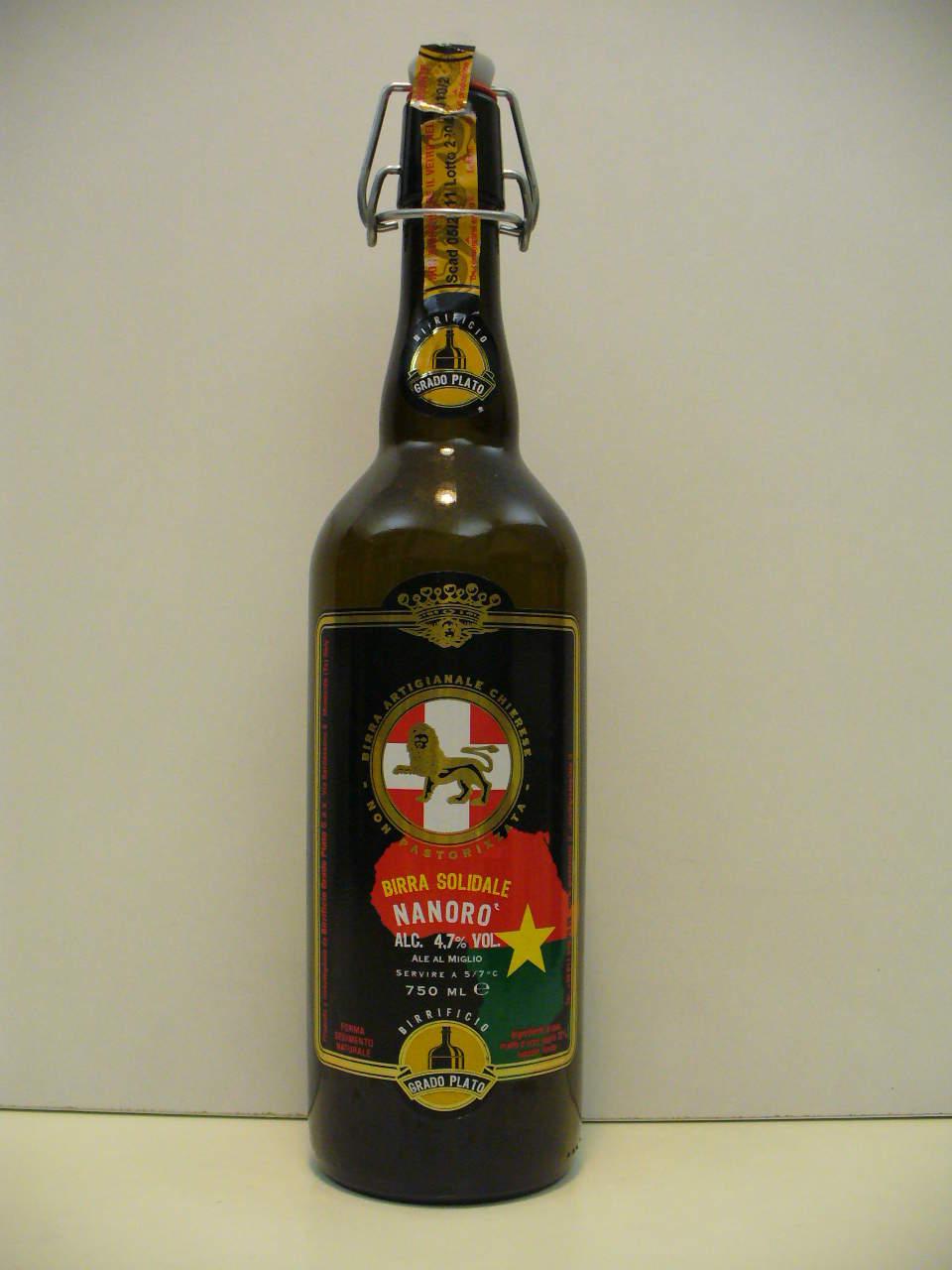 | Note | Questa birra concorre a finanziare il progetto del Comune di Chieri per la costruzione del mercato coperto a Nanorò in Burkina Faso. Birra chiara al miglio, non limpidissima perchè non filtrata, ha un piacevole affumicato che vorrebbe rimandare al fuoco acceso dalle donne di NANORO' per bollire il mosto.Il sapore è nuovo ma rimanda ad un tempo antico, mentre bassa gradazione alcolica e taglio finale secco la rendono dissetante anche nelle giornate più calde. |