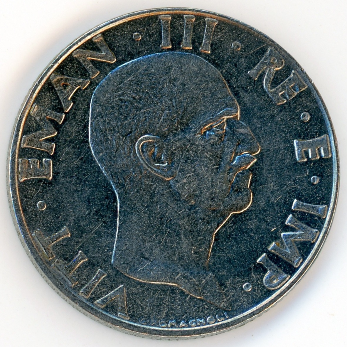 Vista laterale di un'aquila con ali spiegate che ghermisce un fascio, sopra ITALIA, a sinistra millesimo e anno dell'Era Fascista. In basso stemma sabaudo tra il valore (C • 50) con a sinistra il segno di zecca (R).