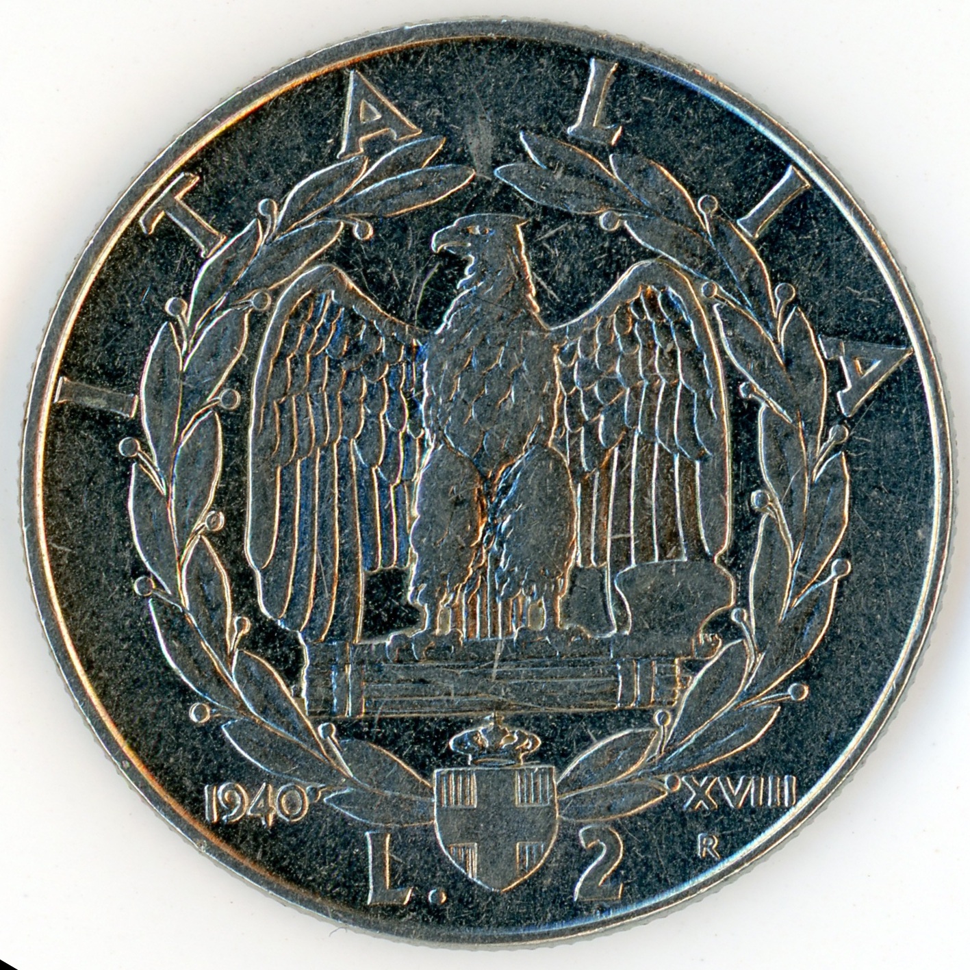 Aquila con ali spiegate e fascio tra gli artigli, intorno, corona di alloro e la scritta: ITALIA. In basso stemma sabaudo tra il valore (L • 2) con a destra la data fascista e il segno di zecca e a sinistra il millesimo.