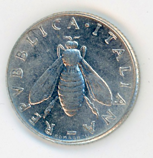 | Retro | Un'ape simbolo, ma auspicio di laboriosità e produttività con intorno l'iscrizione 'REPVBBLICA ITALIANA'. In basso, il nome dell'autore (ROMAGNOLI). |