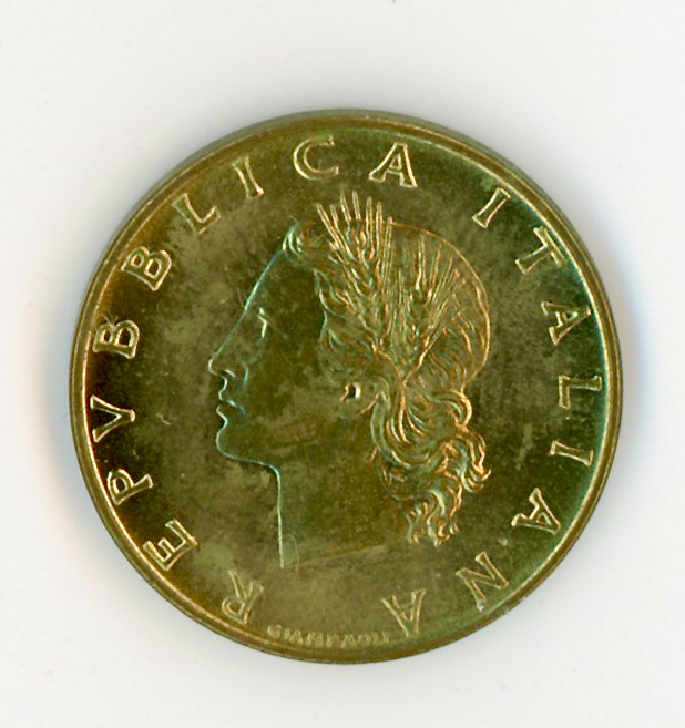 Testa di donna ornata da spighe, intorno REPUBBLICA ITALIANA.Sotto i nomi dell'autore (ROMAGNOLI) e dell'incisore (GIAMPAOLI INC.)