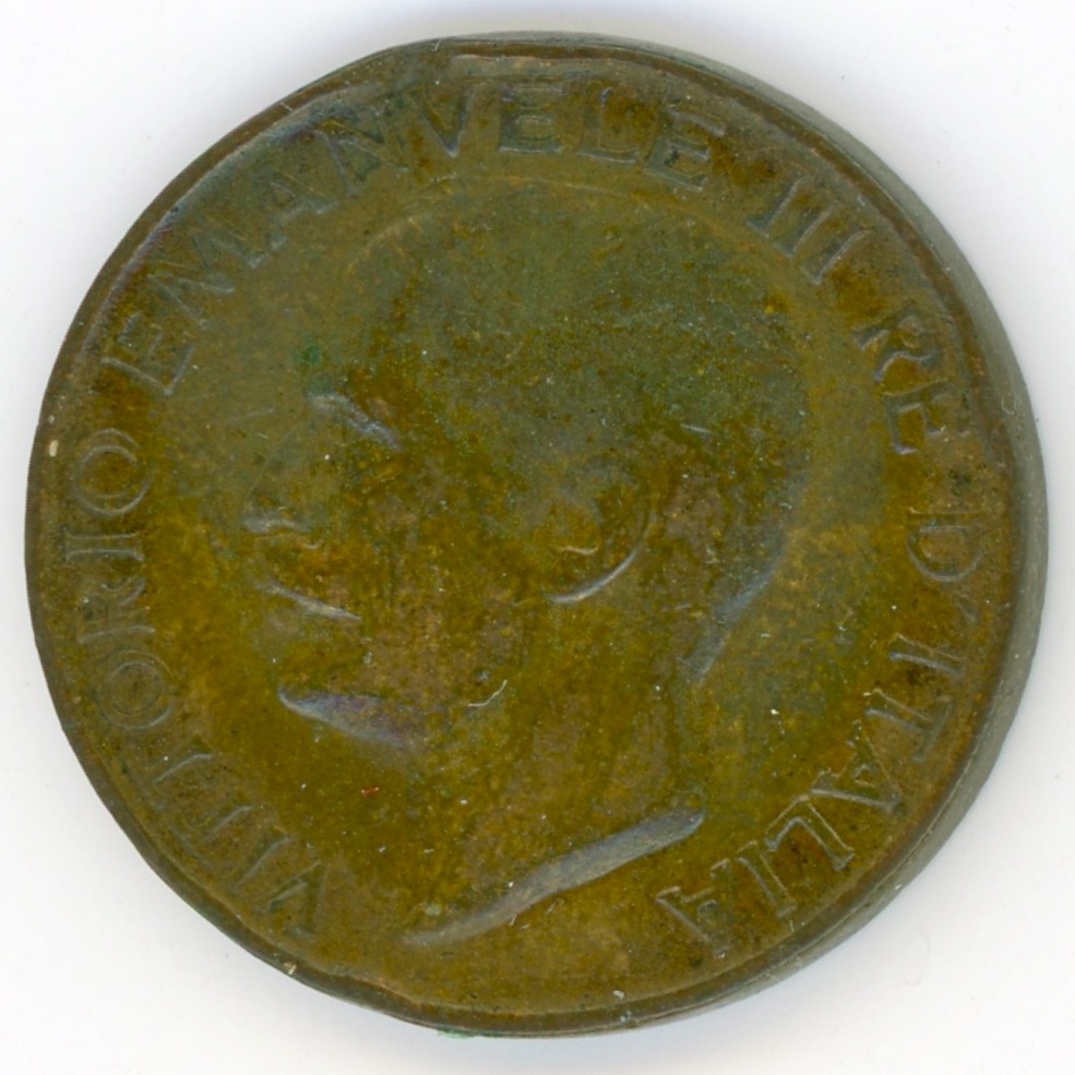 Testa del Re a sinistra. Intorno VITTORIO EMANVELE III RE D'ITALIA. Sotto il collo il nome dell'incisore (A • MOTTI).