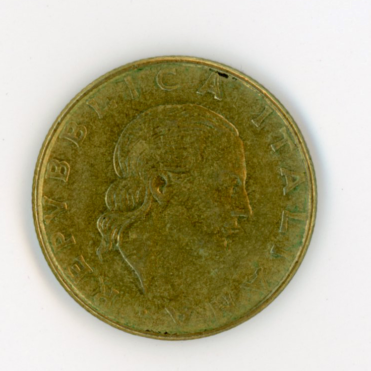 | Retro | Testa di donna rivolta verso destra. Intorno REPVBBLICA ITALIANA e un rombo. In basso, lungo il bordo, indicazione dell'autore VALLUCCI. Prima moneta in cui viene abbandonata la simbologia legata a temi prettamente agricoli e viene scelto un simbolo del mondo industriale. |