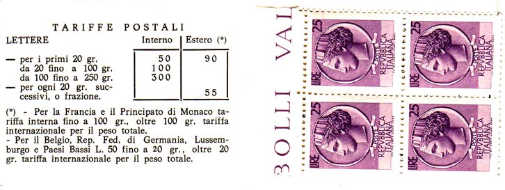 I francobolli sono applicati al libretto tramite il bordo di foglio superiore o inferiore. Il libretto veniva venduto tramite distributori automatici, esclusivamente all'ufficio postale di Ischia; si riconosce dal precedente per il diverso tipo di carattere di molte diciture, graziato e non a bastoncino.