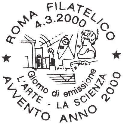 i due francobolli sono uniti tra di loro, lungo il lato di mm 30, in un riquadro perforato posto a centro del foglietto e disposti nel seguente ordine: L'Arte e La Scienza. Fuori dal riquadro, sono riprodotti alcuni dei motivi rappresentati nei francobolli e precisamente, a sinistra, particolari dell'opera che illustra la tematica dell'arte e, a destra, particolari dei dipinto che rappresenta la scienza. Completano il foglietto, in alto, la scritta "POSTE ITALIANE" e, in basso, la leggenda "AVVENTO ANNO DUEMILA"