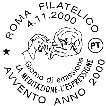 i due francobolli sono uniti tra di loro, lungo il lato di mm 30, in un riquadro perforato posto al centro del foglietto e disposti nel seguente ordine: La Meditazione e L'Espressione. Fuori dal riquadro sono riportati alcuni dei motivi rappresentati nei francobolli e precisamente, a sinistra, particolari della capigliatura e, a destra, particolari del viso di donna. Completano il foglietto, in alto, la scritta "POSTE ITALIANE" e, in basso, la leggenda "AVVENTO ANNO DUEMILA".
