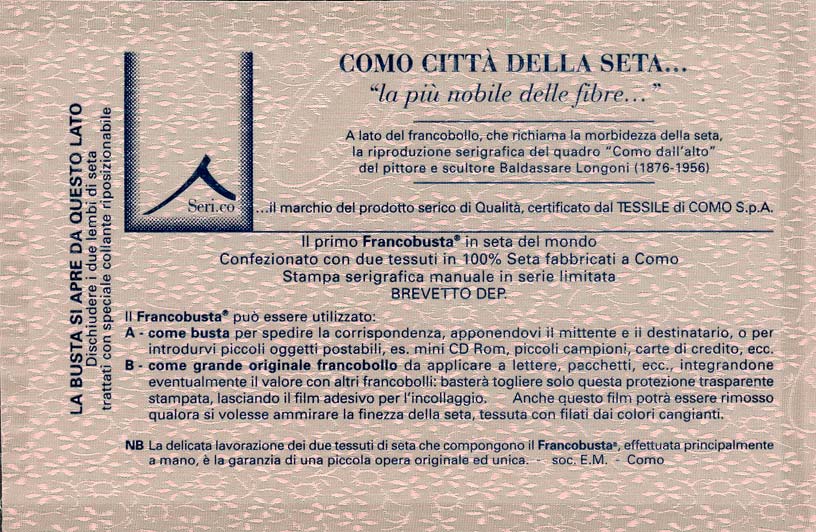 Sul verso della busta in seta è applicata una pellicola biadesiva e su di essa un supporto plastico trasparente amovibile, agendo sugli angoli, per l'eventuale affrancatura di corrispondenza; sul supporto plastico sono stampate notizie e indicazioni per l'utilizzo della busta stessa. La busta è composta di due tessuti in seta pura lavorati a telaio, accoppiati con collante particolare; l'apertura è sul lato destro, dischiudendo i due lembi di seta sovrapposti,pretrattati con una speciale colla riposizionabile. Per il recto è stata utilizzata una seta organza doppio raso con catena e trama su telaio piano, tinto in bianco e quindi stampato manualmente in serigrafia. Per il verso invece è stata utilizzata una seta a fili policromi cangianti con motivi arabescati, tinta in filo sia in ordito che in trama su telaio Jacquard, con un piccolo marchio "PURE SILK MADE IN ITALY".