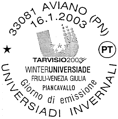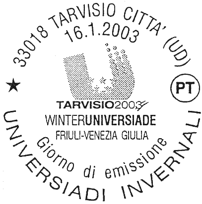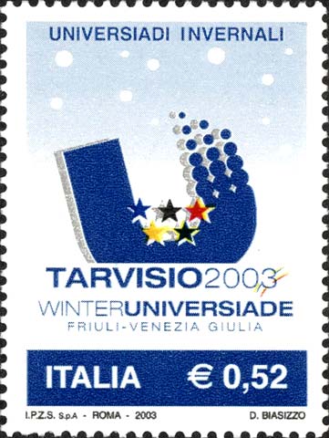riproduce il logo delle Universiadi Invernali che si svolgono in Friuli-Venezia Giulia dal 16 al 26 gennaio 2003; in alto sono rappresentati dei fiocchi di neve. Completano il francobollo la leggenda "UNIVERSIADI INVERNALI" e su una banda di colore bleu, la scritta "ITALIA" ed il valore "€ 0,52"