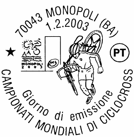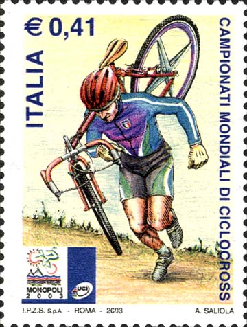 raffigura un atleta di ciclocross che porta sulle spalle la sua bicicletta, a rappresentare la specifica disciplina sportiva; in basso a sinistra è riprodotto il logo dei Campionati mondiali di Ciclocross che si svolgono a Monopoli il 2 e il 3 febbraio 2003. Completano il francobollo la leggenda "CAMPIONATI MONDIALI DI CYCLOCROSS", la scritta "ITALIA" ed il valore "€ 0,41"