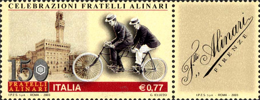 riproduce un acquerello raffigurante due uomini in tandem con Palazzo Vecchio in Firenze sullo sfondo, liberamente ispirato ad alcune fotografie d'epoca tratte dal patrimonio iconografico Fratelli Alinari, azienda operante nel campo della fotografia, delle immagini e della comunicazione, fondata a Firenze nel 1852. Completano il francobollo il logo del 150º anniversario della fondazione dell'azienda, la leggenda "CELEBRAZIONI FRATELLI ALINARI", la scritta "ITALIA" ed il valore "€ 0,77". A ciascun francobollo, sul lato destro, è acclusa un'appendice perforata, nella quale è riprodotta la firma corsiva "F.lli Alinari" e la scritta "FIRENZE"