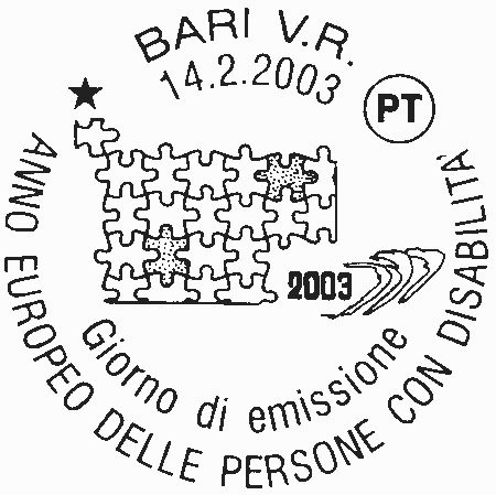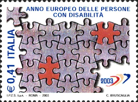 raffigura un puzzle in cui due tessere si differenziano nel colore dalle altre; in basso a destra è riprodotto il logo dell'anno europeo delle persone con disabilità 2003. Completano il francobollo la leggenda "ANNO EUROPEO DELLE PERSONE CON DISABILITÀ, la scritta "ITALIA" ed il valore "€ 0,41"