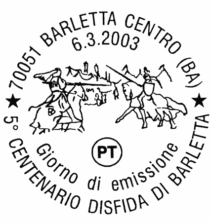 riproduce il dipinto denominato 'Disfida di Barletta' raffigurante un torneo di due cavalieri. Completano il francobollo la leggenda "5° CENTENARIO DISFIDA DI BARLETTA", la scritta "ITALIA" ed il valore "€ 0,41"