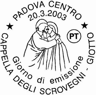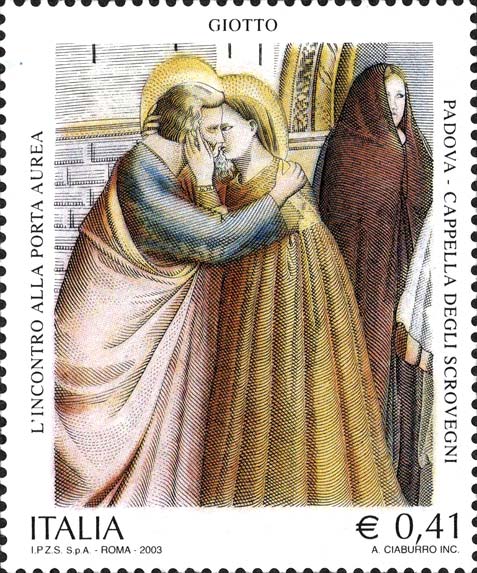 raffigura un particolare dell'affresco denominato 'L'incontro alla Porta Aurea' appartenente al ciclo pittorico realizzato da Giotto nella Cappella degli Scrovegni in Padova. Completano il francobollo le leggende "L'INCONTRO ALLA PORTA AUREA", "GIOTTO" e "PADOVA-CAPPELLA DEGLI SCROVEGNI", la scritta "ITALIA" ed il valore "€ 0,41"