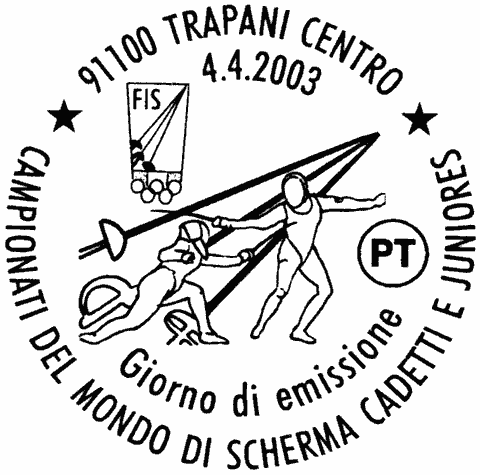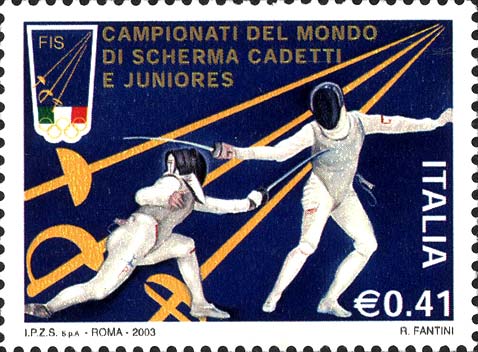 raffigura due schermidori in azione, rappresentati su un fondo blu dove figurano il fioretto la sciabola e la spada, le tre armi con le quali si pratica la scherma; in alto a sinistra è riprodotto il logo della Federazione Italiana Scherma. Completano il francobollo la leggenda "CAMPIONATI DEL MONDO DI SCHERMA CADETTI E JUNIORES", la scritta "ITALIA" ed il valore "€ 0,41"