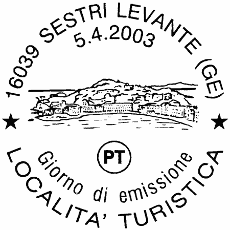 riproduce, entro una cornice lineare dorata, una veduta pittorica della località. Sestri Levante: una veduta panoramica del centro antico della città situato su un promontorio collegato alla terra ferma da un sottile istmo. Completa il francobollo la rispettiva leggenda, la scritta "ITALIA" ed il valore "€ 0,41".