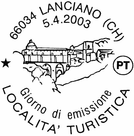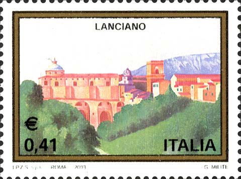 riproduce, entro una cornice lineare dorata, una veduta pittorica della località. Lanciano: una veduta panoramica del centro storico della cittadina abruzzese con la cupola della Cattedrale della Madonna del Ponte, la Torre civica e il complesso architettonico della Chiesa di S. Francesco, dove è custodito il "Miracolo Eucaristico". Completa il francobollo la rispettiva leggenda, la scritta "ITALIA" ed il valore "€ 0,41".