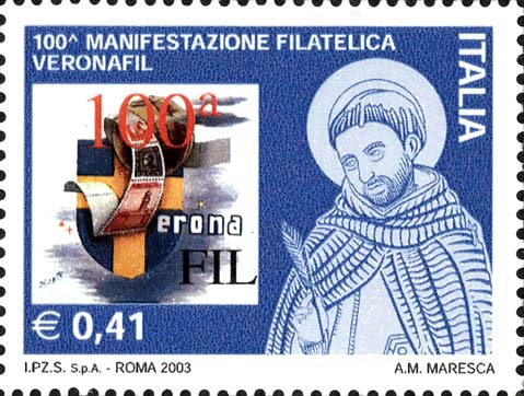 riproduce, a sinistra, il logo della centesima edizione della manifestazione filatelica Veronafil e, a destra, è raffigurata una immagine monocromatica di San Pietro Martire da Verona. Completano il francobollo la leggenda "100^ MANIFESTAZIONE FILATELICA VERONAFIL", la scritta "ITALIA" ed il valore "€ 0,41"