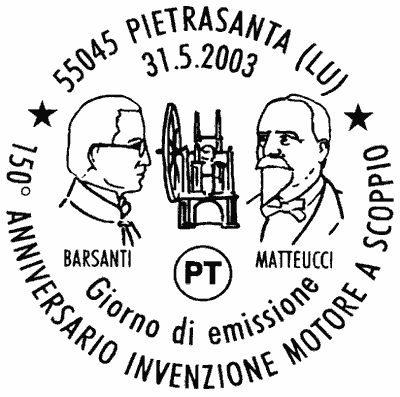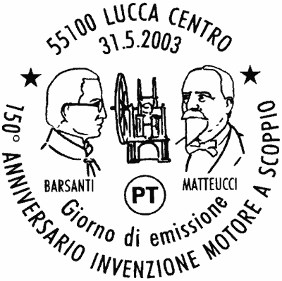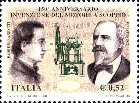raffigura in primo piano, a sinistra Padre Eugenio Barsanti a destra Felice Matteucci, inventori del motore a scoppio; al centro è rappresentato il motore bicilindrico costruito dall'Officina Pietro Benini di Firenze; sullo sfondo è riprodotta una Azione della Società Anonima del Nuovo Motore Barsanti e Matteucci, fondata dai due scienziati a Firenze il 14 ottobre 1859, per la produzione e la vendita dei loro motori. Completano il francobollo le leggende "PADRE E. BARSANTI", "150° ANNIVERSARIO INVENZIONE DEL MOTORE A SCOPPIO" e "F. MATTEUCCI", la scritta "ITALIA" ed il valore "€ 0,52