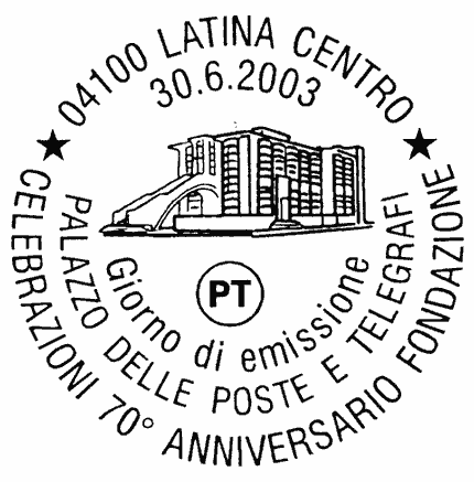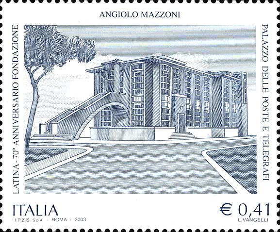 raffigura una prospettiva del "PALAZZO DELLE POSTE E TELEGRAFI", in Latina, progettato dall'architetto "ANGIOLO MAZZONI". Completano il francobollo la leggenda "LATINA-70° ANNIVERSARIO FONDAZIONE", la scritta "ITALIA", ed il valore "€ 0,41"