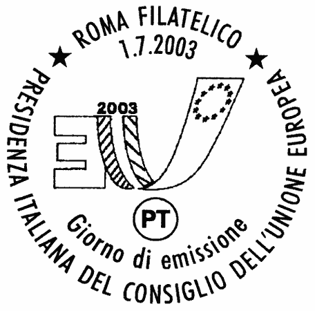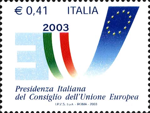 riproduce su fondo bianco, il logo del semestre di "PRESIDENZA ITALIANA DEL CONSIGLIO DELL'UNIONE EUROPEA" che si eserciterà da luglio a dicembre 2003. Completano il francobollo la scritta "ITALIA" ed il valore "€ 0,41"