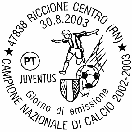 raffigura, a sinistra, un calciatore in azione di gioco che indossa i colori bianconeri e, a destra, un pallone in rete e uno scudetto. Completano il francobollo la leggenda "JUVENTUS CAMPIONE D'ITALIA 2002-2003", la scritta "ITALIA" ed il valore "€ 0,41"