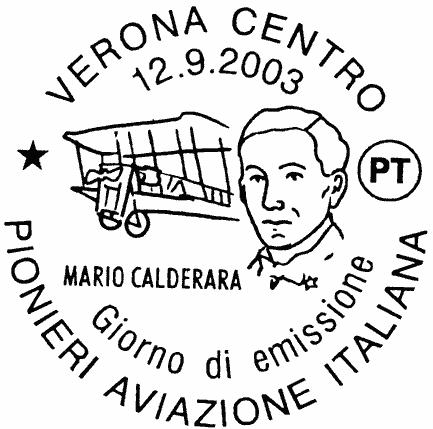 raffigura, in primo piano, l'immagine di "MARIO CALDERARA", uno dei quattro aviatori italiani considerati pionieri dell'aviazione italiana e, sullo sfondo, uno dei velivoli da lui stesso progettato. Completano ogni francobollo la leggenda "PIONIERI AVIAZIONE ITALIANA", la scritta "ITALIA" ed il valore "€ 0,52".