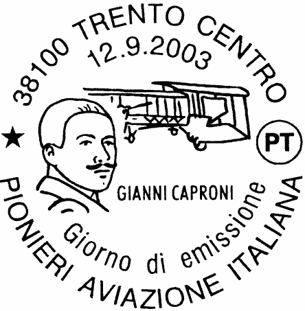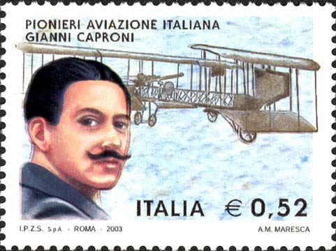 raffigura, in primo piano, l'immagine di "GIANNI CAPRONI", uno dei quattro aviatori italiani considerati pionieri dell'aviazione italiana e, sullo sfondo, uno dei velivoli da lui stesso progettato. Completano ogni francobollo la leggenda "PIONIERI AVIAZIONE ITALIANA", la scritta "ITALIA" ed il valore "€ 0,52".