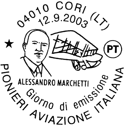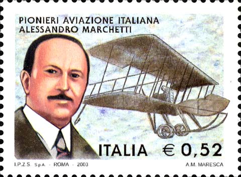 raffigura, in primo piano, l'immagine di "ALESSANDRO MARCHETTI", uno dei quattro aviatori italiani considerati pionieri dell'aviazione italiana e, sullo sfondo, uno dei velivoli da lui stesso progettato. Completano ogni francobollo la leggenda "PIONIERI AVIAZIONE ITALIANA", la scritta "ITALIA" ed il valore "€ 0,52".