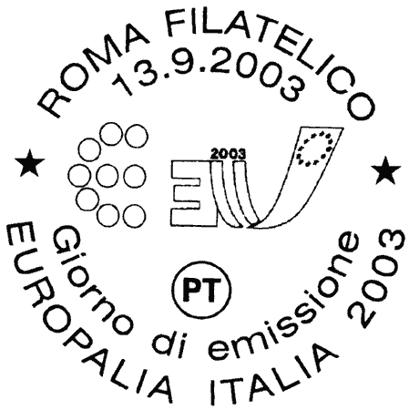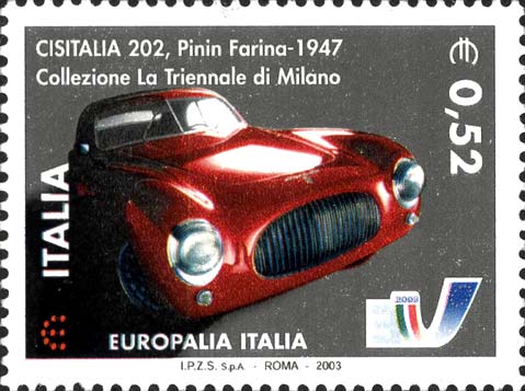 riproduce un simbolo del patrimonio artistico e culturale e della creatività italiana a rappresentare l'Italia per l'emissione comune dedicata al festival "Europalia Italia 2003" organizzato in Belgio in occasione del semestre di Presidenza Italiana del Consiglio dell'Unione Europea, e precisamente l'autovettura berlinetta Cisitalia 202 a due posti realizzata su design di Pinin Farina nel 1947 ed esposta nel MOMA, il Museo d'Arte Moderna di New York, con le leggende "CISITALIA 202, PININ FARINA-1947" e "COLLEZIONE LA TRIENNALE DI MILANO". Completano il francobollo il logo "EUROPALIA ITALIA", il logo del semestre di Presidenza Italiana del Consiglio dell'Unione Europea, la scritta "ITALIA" e il rispettivo valore "€ 0,52".