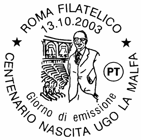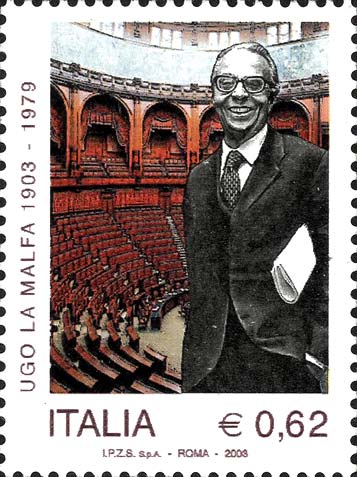raffigura, in primo piano a destra, l'immagine dello statista Ugo La Malfa e, sullo sfondo, una prospettiva dell'interno della Camera dei Deputati. Completano il francobollo la leggenda "UGO LA MALFA 1903 - 1979", la scritta "ITALIA" ed il valore "€ 0,62"