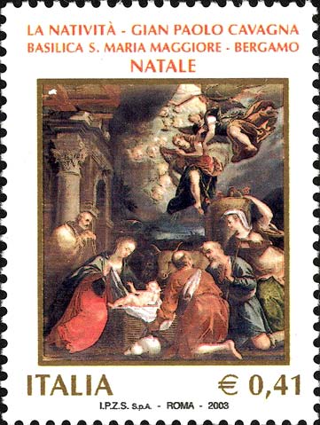 riproduce il dipinto "La Natività", opera di Gian Paolo Cavagna esposta nella Basilica di Santa Maria Maggiore in Bergamo. Completano il francobollo le leggende "LA NATIVITÀ - GIAN PAOLO CAVAGNA", "BASILICA S. MARIA MAGGIORE - BERGAMO" e "NATALE", la scritta "ITALIA" ed il valore "€ 0,41".
