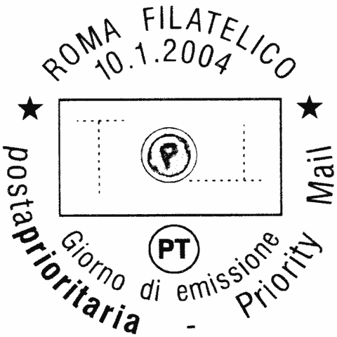 la grafica è costituita da un fondino verde, posizionato entro una cornice in oro, con al centro un elemento circolare raffigurante l'impronta tridimensionale della lettera P .La vignetta è completata da linee rette che si toccano perpendicolarmente ai due angoli opposti, sinistro in alto e destro in basso, e che delimitano la scritta "ITALIA", la leggenda "postaprioritaria" ed il valore "€ 1,40", posti in senso orario all'esterno delle linee stesse. È stato emesso per poter affrancare la corrispondenza prioritaria di secondo porto, la cui tariffa è stata modificata all'inizio del 2004.