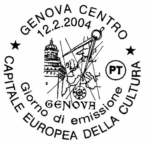 raffigura sullo sfondo un'antica carta geografica, in primo piano a destra un compasso puntato sulla città di Genova, al centro la 'rosa dei venti' e a sinistra la 'Lanterna', il faro simbolo della città. Completano il francobollo la leggenda "GENOVA CAPITALE EUROPEA DELLA CULTURA", la scritta "ITALIA" ed il valore "€ 0,45"