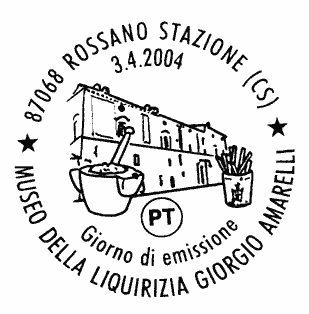 raffigura, sullo sfondo, una prospettiva del palazzo quattrocentesco sede del Museo della Liquirizia 'Giorgio Amarelli' in primo piano sono rappresentati, a sinistra un mortaio con il pestello, antico attrezzo per la lavorazione della liquirizia e, a destra un contenitore con dei bastoncini di liquirizia, sul quale è riportato lo stemma della famiglia Amarelli. Completano il francobollo le leggende "ROSSANO", "MUSEO DELLA LIQUIRIZIA" e "GIORGIO AMARELLI", la scritta "ITALIA" ed il valore "€ 0,45"