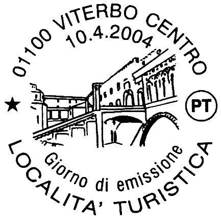 riproduce, entro una cornice lineare dorata, una veduta pittorica della località di Viterbo: un particolare del Palazzo dei Papi, eretto nella seconda metà del XIII secolo. Completano il francobollo le rispettive leggende, la scritta "ITALIA" ed il valore "€ 0,45".