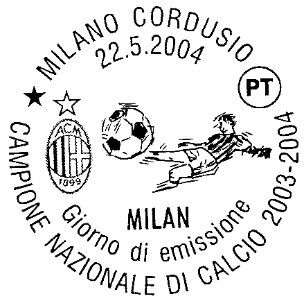 raffigura un calciatore che indossa i colori rossoneri mentre calcia un pallone; in basso sono riprodotti, a sinistra, lo stemma dell'Associazione Calcio Milan e, a destra, lo scudetto tricolore. Completano il francobollo la leggenda "A.C.MILAN CAMPIONE D'ITALIA 2003-2004"; la scritta "ITALIA" ed il valore "€ 0,45"sono posti a destra su una banda rossonera