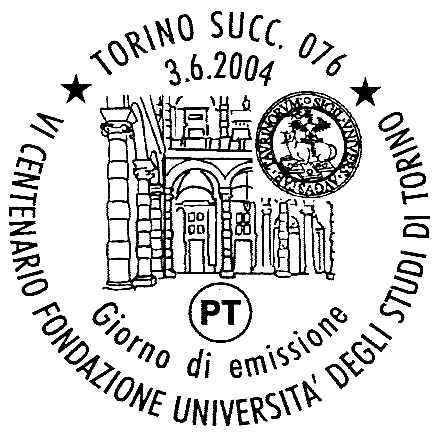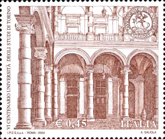 raffigura uno scorcio del cortile interno dell'Università degli Studi di Torino; in alto a destra è riprodotto il sigillo dell'antico Ateneo. Completano il francobollo la leggenda "VI CENTENARIO UNIVERSITA' DEGLI STUDI DI TORINO" , la scritta "ITALIA" ed il valore "€ 0,45"