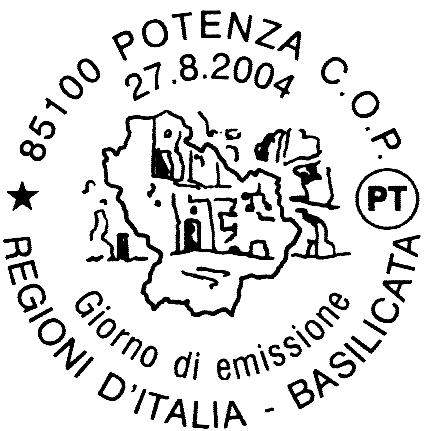 è delimitato in alto e a sinistra da una fascia tricolore che riproduce, all'interno di un occhiello, lo stemma della relativa regione e rappresenta per la Basilicata: i Sassi di Matera, esempio di architettura rupestre, dove si evidenzia il profilo della regione.
