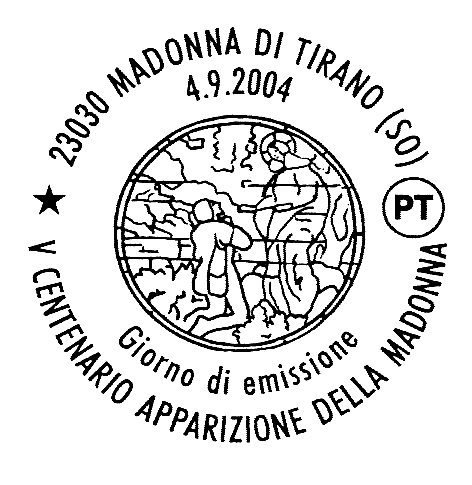 riproduce, su un fondino nero, la vetrata tonda centrale della facciata principale del Santuario della Madonna di Tirano, raffigurante la scena dell'apparizione della Madonna a Mario Homodei, all'alba del 29 settembre 1504. Completano il francobollo le leggende "V CENTENARIO APPARIZIONE" e "MADONNA DI TIRANO", la scritta "ITALIA" ed il valore "€ 0,45"