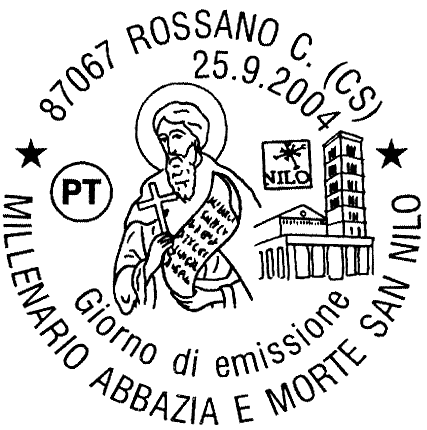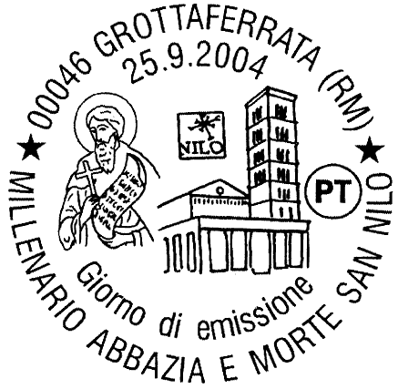 riproduce, a sinistra, una icona conservata nell'antico monastero raffigurante San Nilo di Rossano, morto a Grottaferrata il 26 settembre 1004; a destra, è rappresentata una prospettiva della facciata principale dell'Abbazia di San Nilo in Grottaferrata e la riproduzione del logo realizzato per il millenario della fondazione. Completano il francobollo la leggenda "MILLENARIO MORTE SAN NILO DI ROSSANO E FONDAZIONE ABBAZIA DI GROTTAFERRATA", la scritta "ITALIA" ed il valore "€ 0,45".