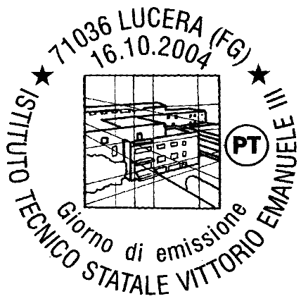 raffigura un disegno dell'edificio visto dall'alto, sede dell'Istituto Tecnico Statale "Vittorio Emanuele III", in Lucera, dove si evidenziano ideali linee di fuga. Completano il francobollo la leggenda "ISTITUTO TECNICO STATALE VITTORIO EMANUELE III LUCERA" , la scritta "ITALIA" ed il valore "€ 0,45".