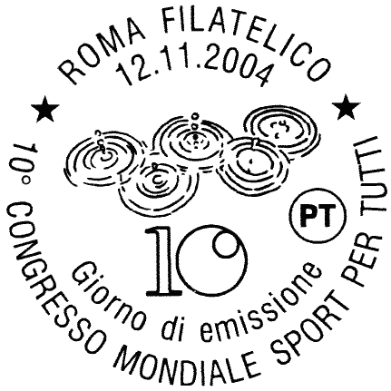 è suddivisa in tre parti, in alto è riportato il logo del 10° CONGRESSO MONDIALE DELLO SPORT PER TUTTI"; al centro è raffigurato uno specchio d'acqua dove alcune gocce formano cinque cerchi concentrici a rappresentare i cerchi olimpici; in basso è riprodotto il nuovo logo del CONI e l'indicazione "ROMA 2004". Completano il francobollo la scritta "ITALIA" ed il valore "€ 0,65".
