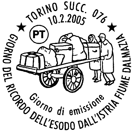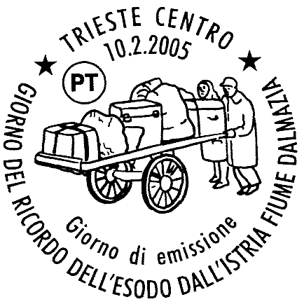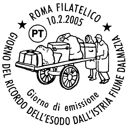 raffigura una scena drammatica a rappresentare lo storico esodo degli italiani dall'Istria, Fiume e Dalmazia. Completano il francobollo la leggenda "GIORNO DEL RICORDO DELL'ESODO DALL'ISTRIA FIUME E DALMAZIA", la scritta "ITALIA" ed il valore "€ 0,45".