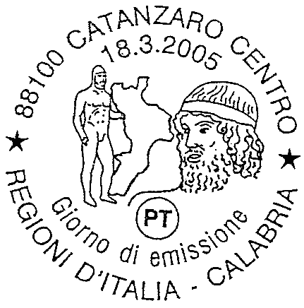 delimitato, in alto e a sinistra, da una fascia tricolore che riproduce, all'interno di un occhiello, lo stemma della relativa regione e rappresenta per la Calabria: sono riprodotti il particolare del volto e la figura intera delle due statue greche 'Bronzi di Riace', tra le quali figura il profilo della regione, in cui è rappresentata una veduta di mare e cielo; sullo sfondo, a sinistra, è ripetuto il volto di una delle due statue. Completano il francobollo la rispettiva leggenda "CALABRIA", la scritta "ITALIA" ed il valore "€ 0,45".