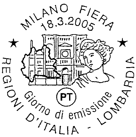delimitato, in alto e a sinistra, da una fascia tricolore che riproduce, all'interno di un occhiello, lo stemma della relativa regione e rappresenta per la Lombardia: in primo piano a destra, un particolare della scultura rinascimentale 'Arca di Gian Galeazzo Visconti' realizzata da Gian Cristoforo Romano, conservata nella Certosa di Pavia sulla cui facciata, raffigurata sul fondo, si evidenzia, a sinistra, il profilo delle regione. Completano il francobollo la rispettiva leggenda "LOMBARDIA", la scritta "ITALIA" ed il valore "€ 0,45".